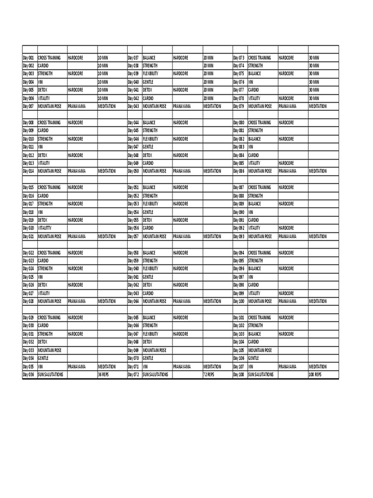 Each of the 14 thematic yoga classes are comprised of creative sequences that will challenge the expert and encourage the beginner. The Ultimate Yogi. First Cycle 1 Yoga Cross Training 2 Yoga Cardio 3 Yoga Strength 4 Yin Yoga 5 Yoga Detox 6 Yoga Vitality 7 Mountain Pose Series. For 108 days you follow the calendar and take transformation into your own hands.